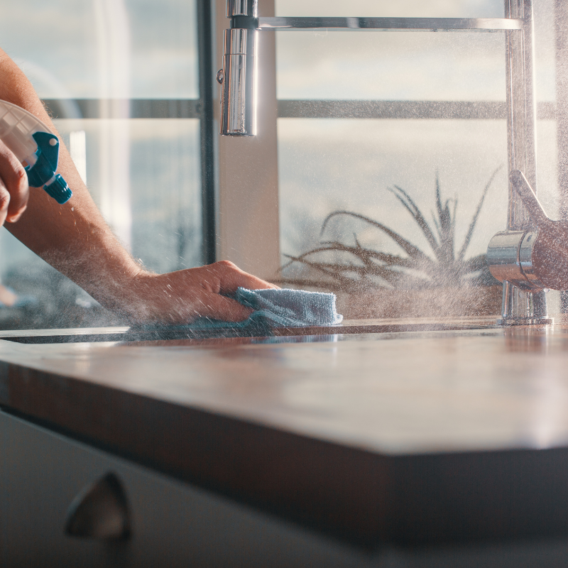 Kitchens: Scrub appliances, countertops, sinks, and cabinets